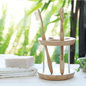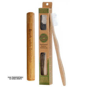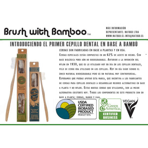 El mango está hecho de 100% de bambú (orgánico y salvaje - sin pesticidas o fertilizantes). El envoltorio alrededor del cepillo de dientes es vegetal y comercialmente compostable. La caja que envuelve el cepillo de dientes se hace del papel, ninguna cinta o pegamento se utiliza.