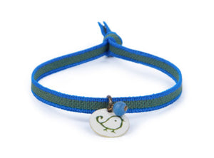 Una hermosa pulsera de esmalte pintada a mano, con el diseño de un dulce pajarito y cordón elástico, de color verde con dos finas líneas azules en los bordes.
